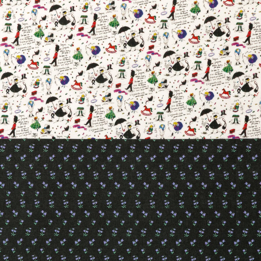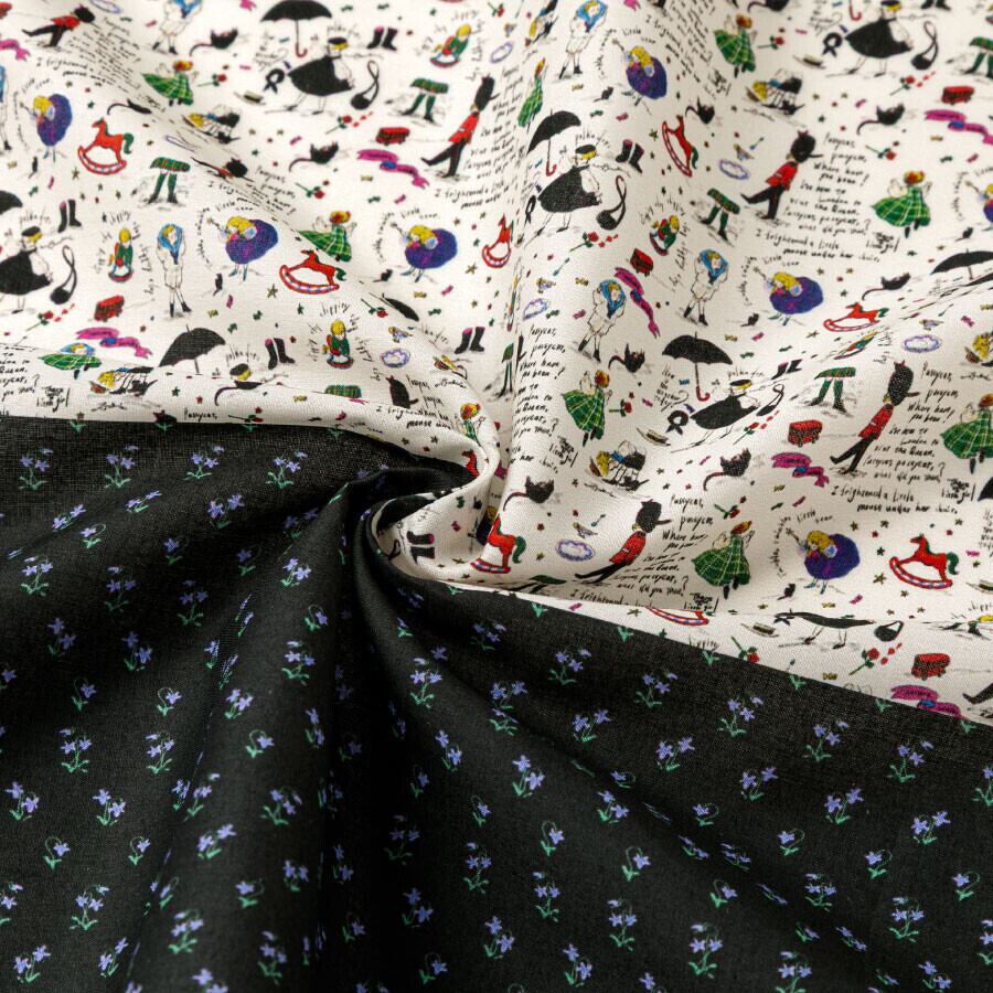 幅約34cm、長さ50cmの生地上に、通常サイズの生地の柄をミニチュアサイズに縮小した柄の生地とくらはしれいさんの描くお洋服の柄を再現した生地の2柄がプリントされています。
