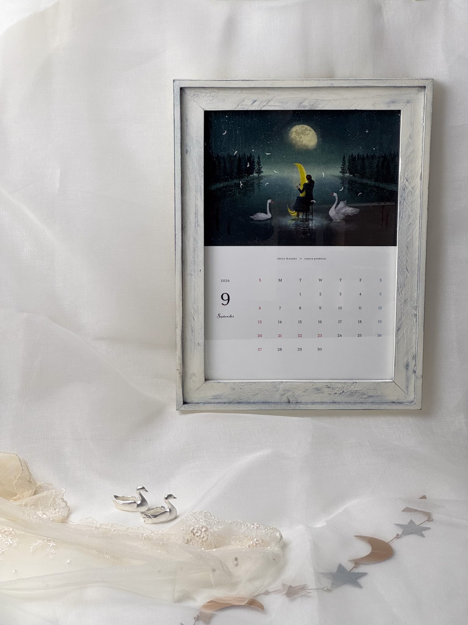 動物と楽器をモチーフに、幻想的で美しい世界が描かれた日下明のカレンダー。イラストを眺め、その背景にある物語に想いを馳せて…ゆったりとした気持ちで過ごせそうな、素敵なカレンダーです。絵画を飾るような感覚で、お部屋のインテリアとしてもお楽しみいただけます。カレンダーには高級紙・ヴァンヌーボを使用しており、しっかりとした作りになっています。一枚一枚切り離されており、ピンで留める、額に入れて飾る、クリアファイルに入れて持ち運ぶなど様々な使い方をお楽しみいただけます。