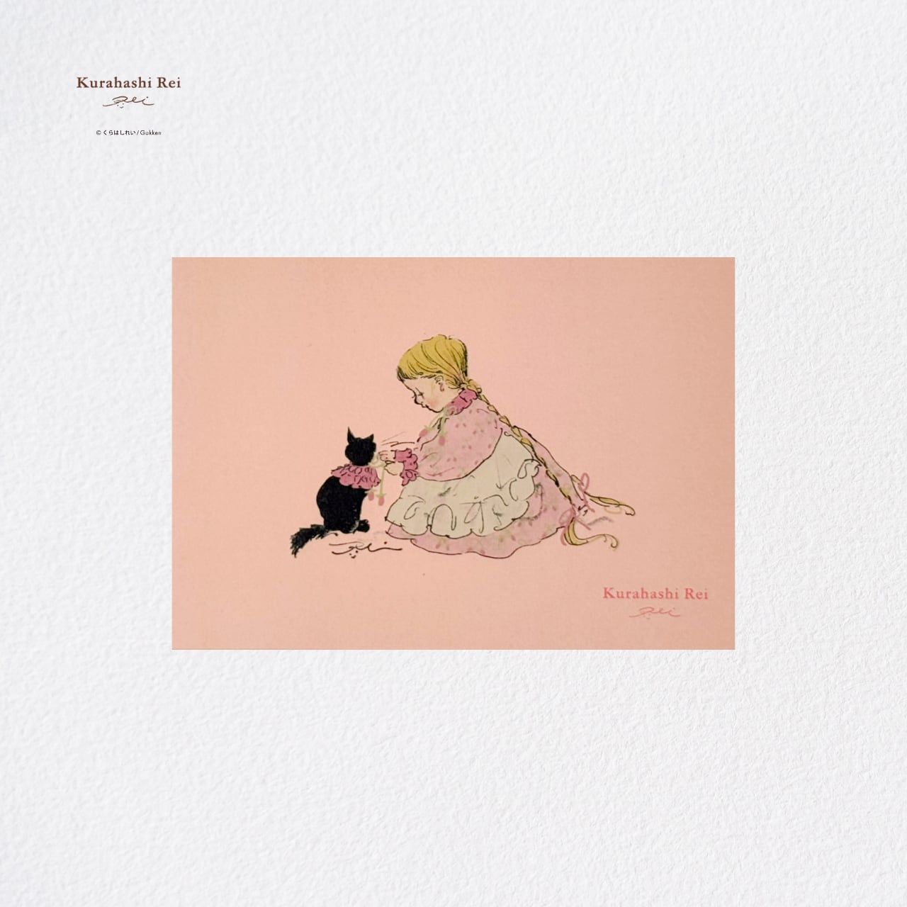 やさしいピンクの背景に、女の子と黒猫が寄り添う愛らしいひとときが描かれた作品。