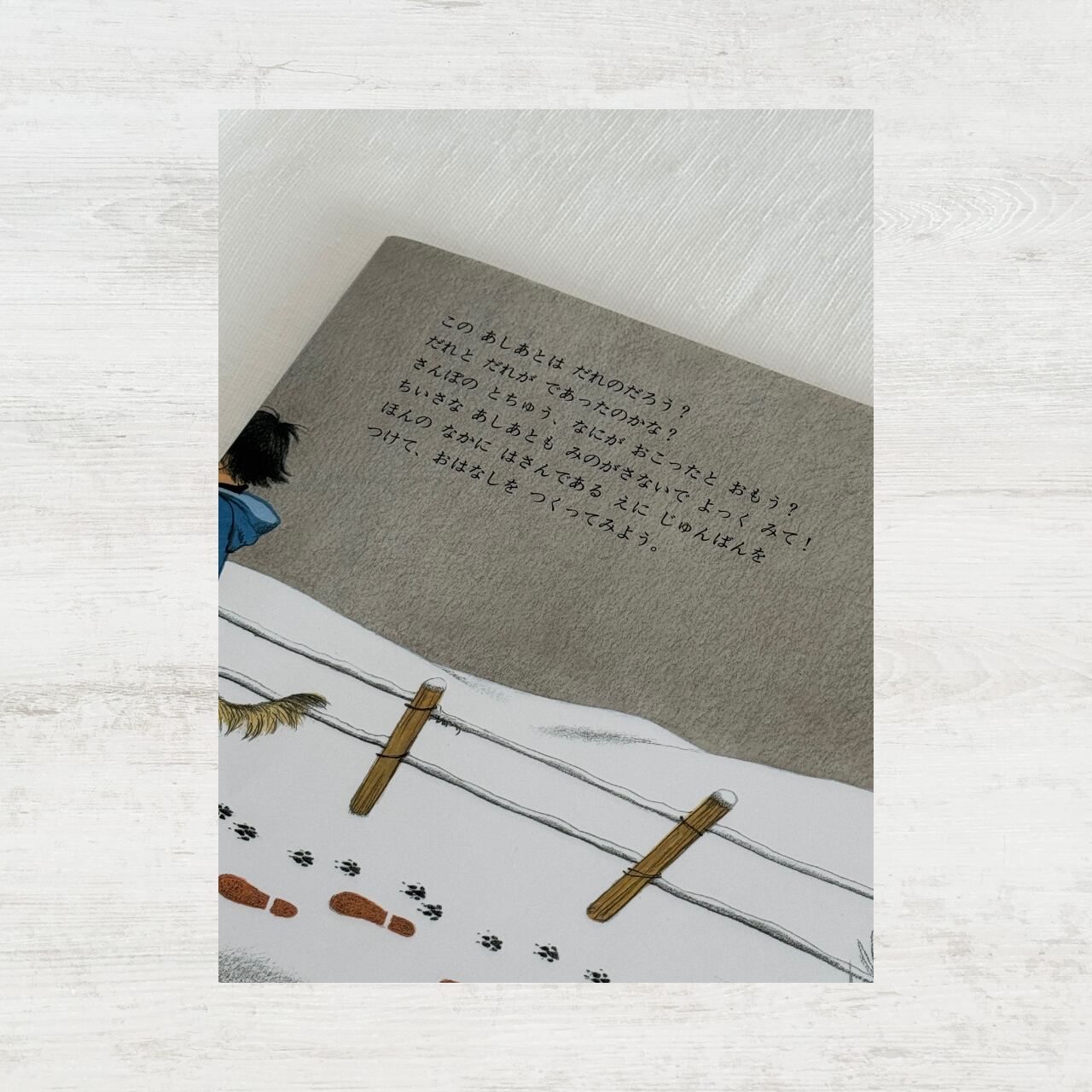 雪の日、家のなかから外にでてゆく“あしあと”。だれのだろう?だれとだれが、であったのかな?さんぽのとちゅう、なにがおこったとおもう?ちいさな“あしあと”もみのがさないで、よっくみて!本にはさんである絵にじゅんばんをつけて、おはなしをつくってみよう。