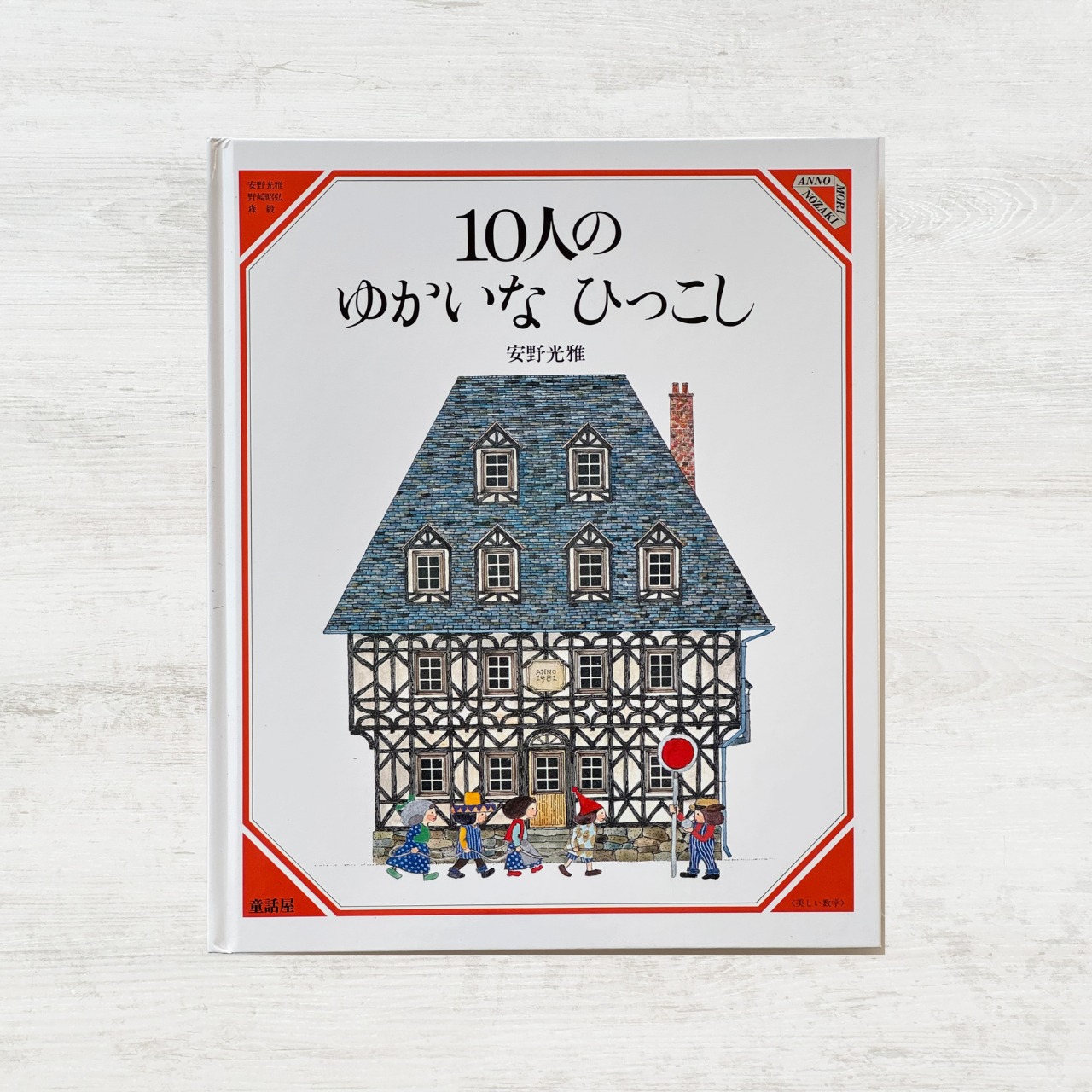 美しい数学シリーズという絵本をつくるにあたって、はじめは足し算と引き算がいい、ということになりました。安野光雅さんには、いいアイディアがありました。絵本を開くと、左ページに家があって、こどもが10人います。右ページには別の家の外面があって、こどもたちは左の家から右の家にひっこしていきます。ページをめくれば、引っ越し先の家のなか。なんにんひっこししたのかな?家の外面の絵の窓は、実際5つが開いていて(穴あきです)、こどもたちがのぞいたりかくれたり。さて、ここにぜんぶでなんにんいるのかな?と、いくつもの引き算と足し算をすることができます。