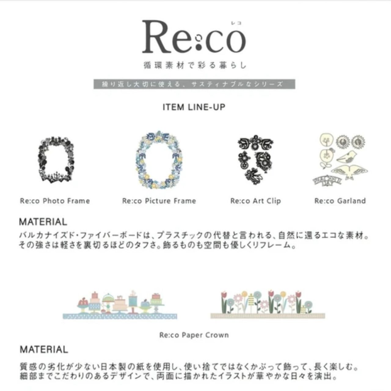 【Re:co】は、循環素材やリサイクルを取り入れた、繰り返し大切に使えるサステナブルなシリーズです。人にも地球にもやさしい素材を選び、ものや時間、気持ちを循環させる暮らしを提案します。バルカナイズド・ファイバーボードは、セルロースを原料に作られた、プラスチックの代替として注目される自然に還るエコ素材です。石油化学製品に代わる環境にやさしいこの素材は、一枚の紙から広がるシンプルで自由な切り絵の世界を生み出し、微細で滑らかな加工技術によってその美しさが一層際立ちます。
