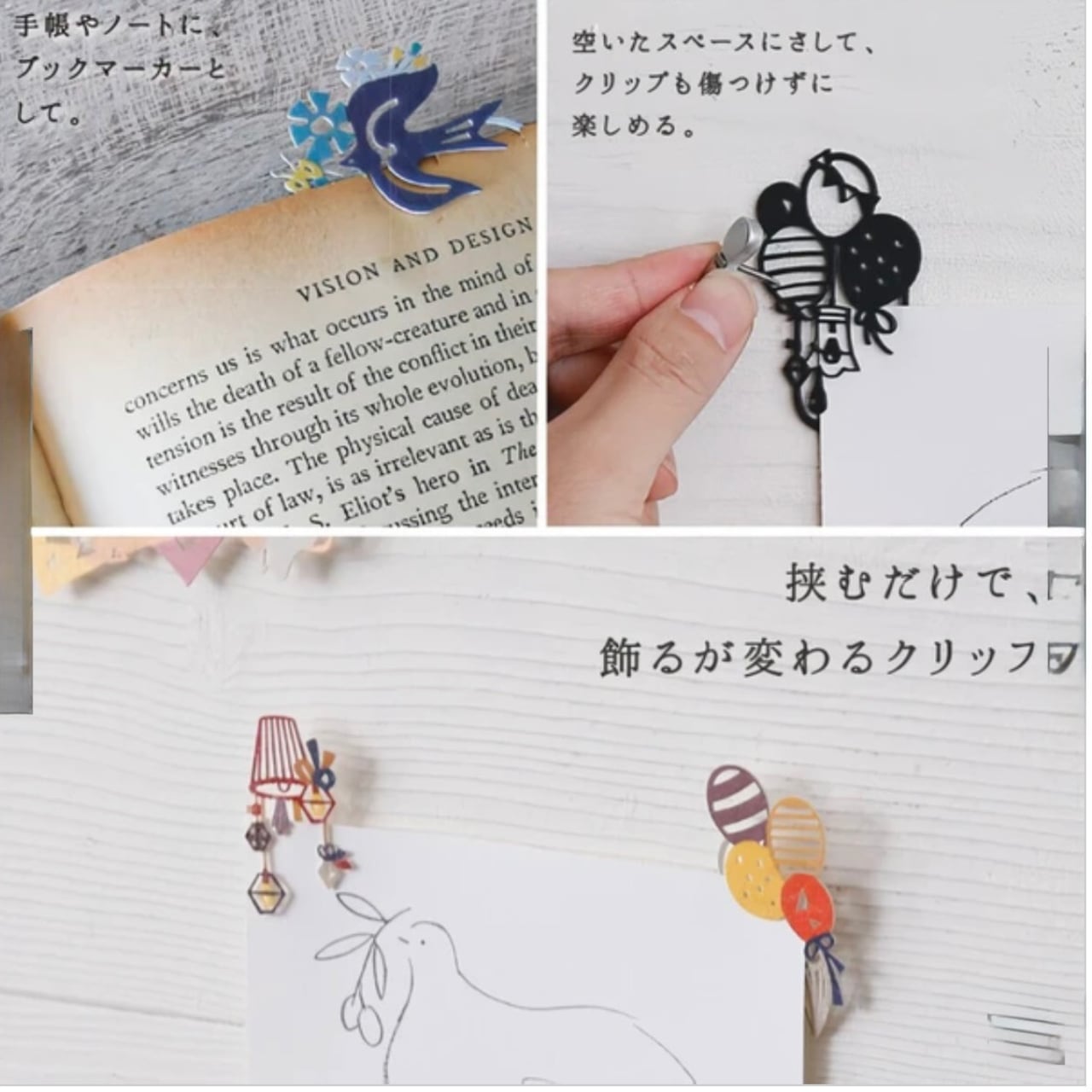 切り絵風のアートクリップです。写真やカードを傷つけずにやさしく挟み、飾るものを引き立てます。通常のクリップして使う以外にも手帳やノートにブックマークとして使ったり、穴を開けたくない写真やポストカード、お子様の作品などを挟んで壁に押しピンでとめることの出来るクリップです。