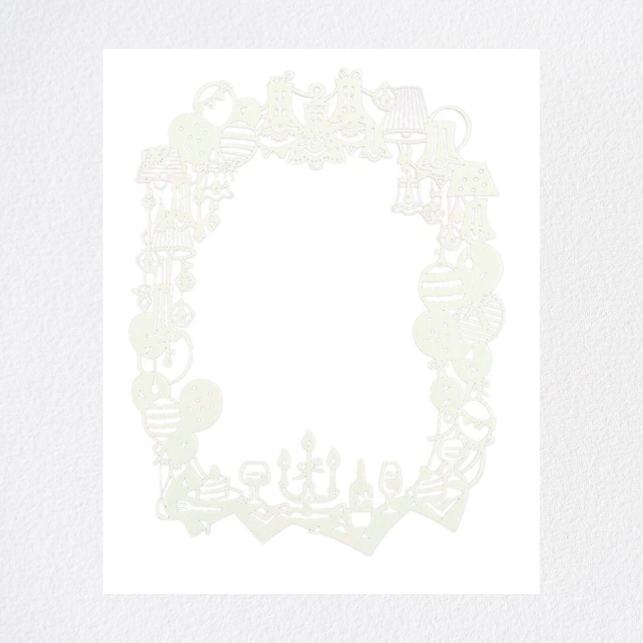 切り絵風のフォトフレームです。ハガキサイズを飾るのにちょうどいいサイズ。軽量なので細いピンひとつで簡単に取り付け可能。お子様の写真を飾るフォトフレームの代わりとして、またはドライフラワーと組み合わせて飾るほか、テグスなどの紐を付ければリースオーナメントとしてもお楽しみいただけます。